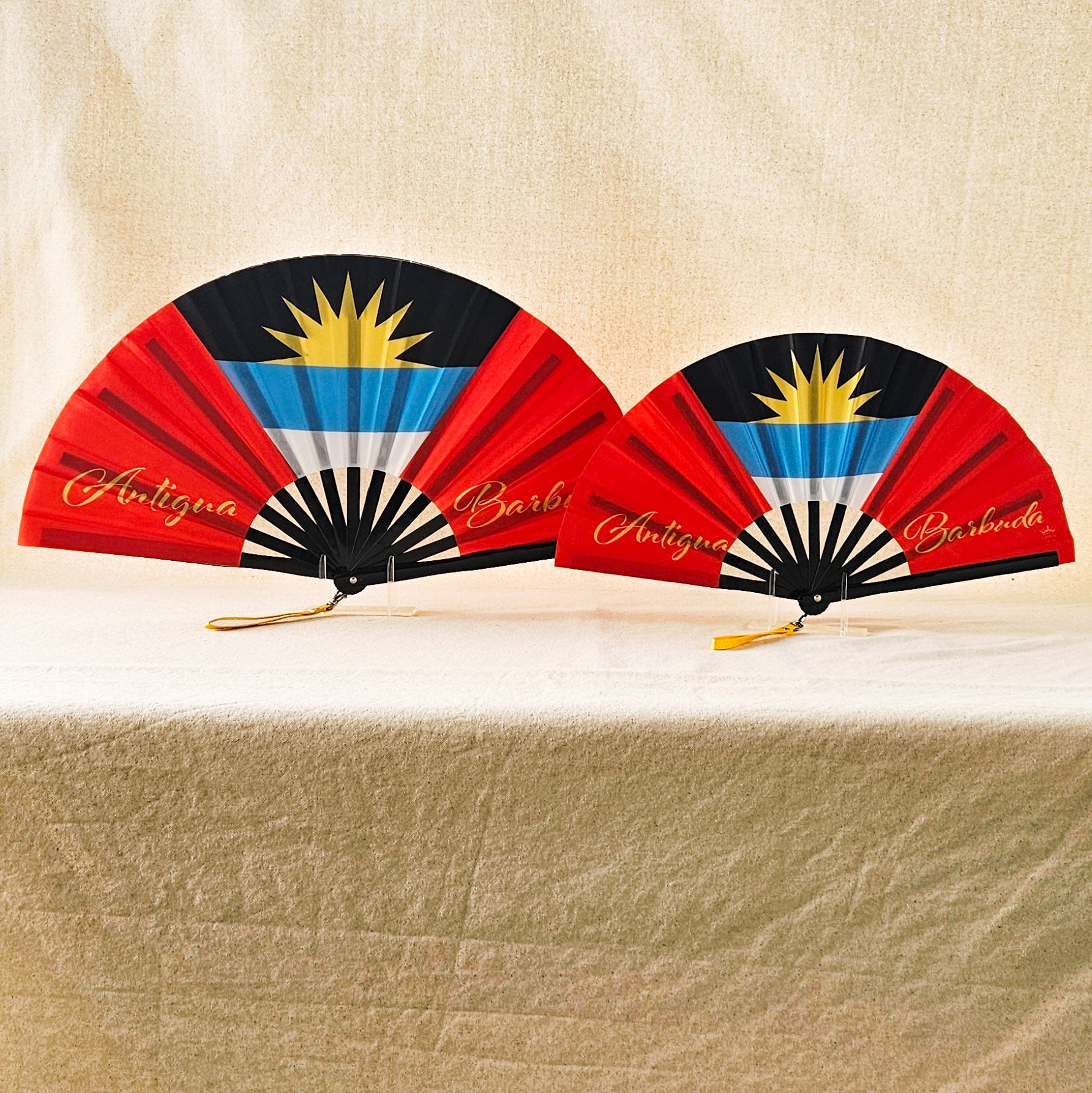 Celebrate Antigua & Barbuda with this premium Caribbean folding hand fan inspired by the island’s bold red, black, blue, and white flag. Featuring the iconic rising sun emblem, this Antigua flag fan blends island pride with tropical elegance. A perfect accessory for festivals, travel, or everyday cool-down moments, it honors Antiguan and Barbudan culture with every breeze.