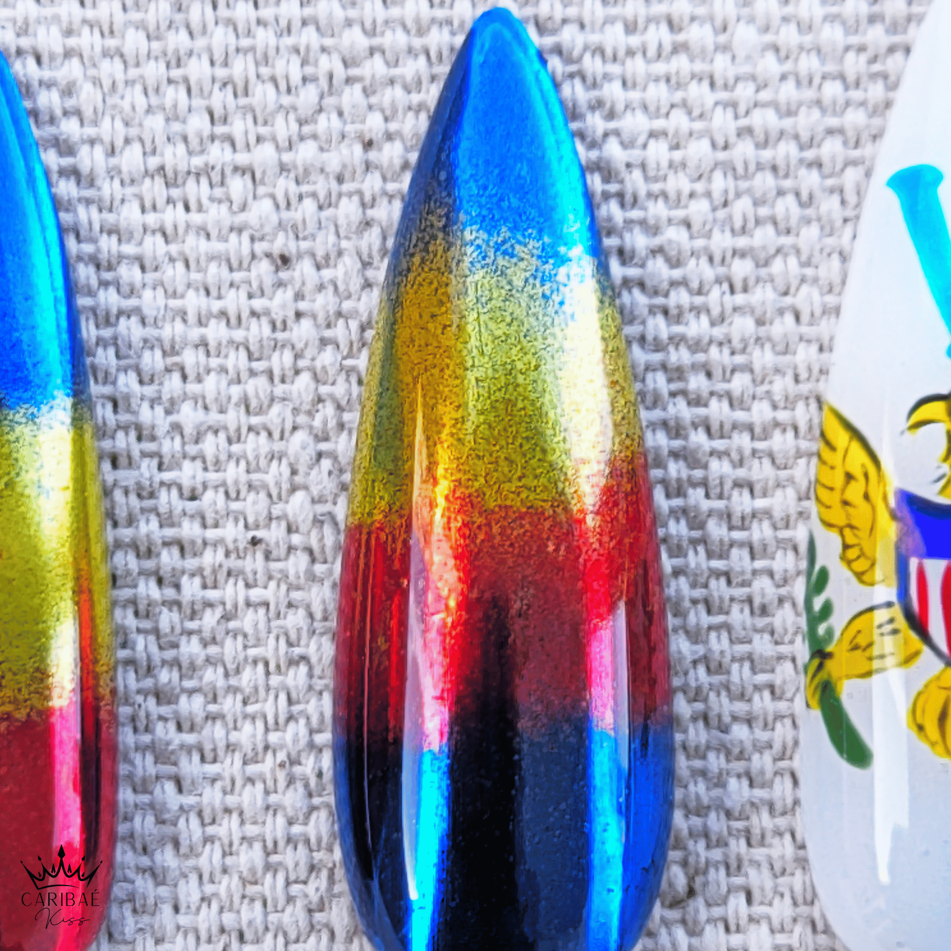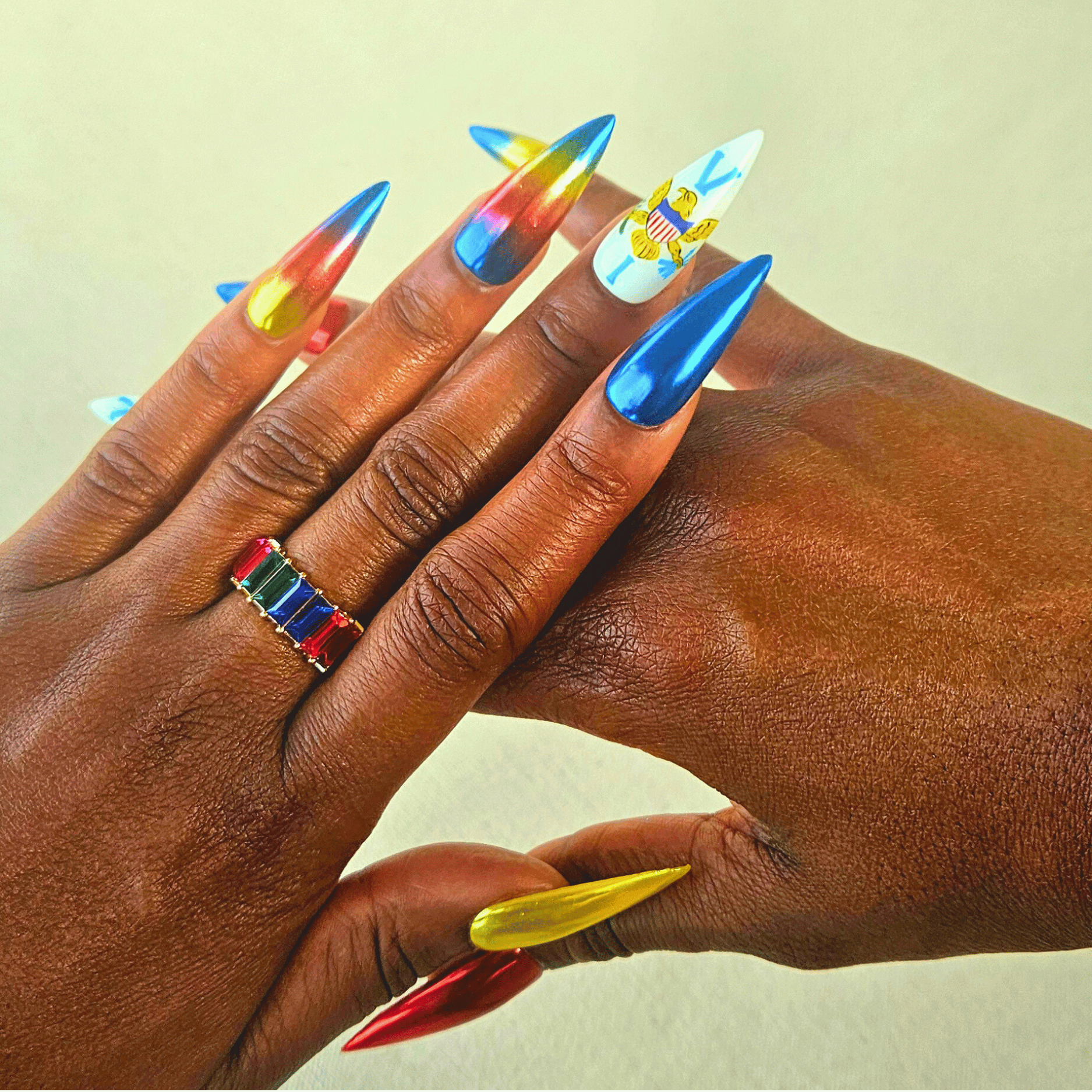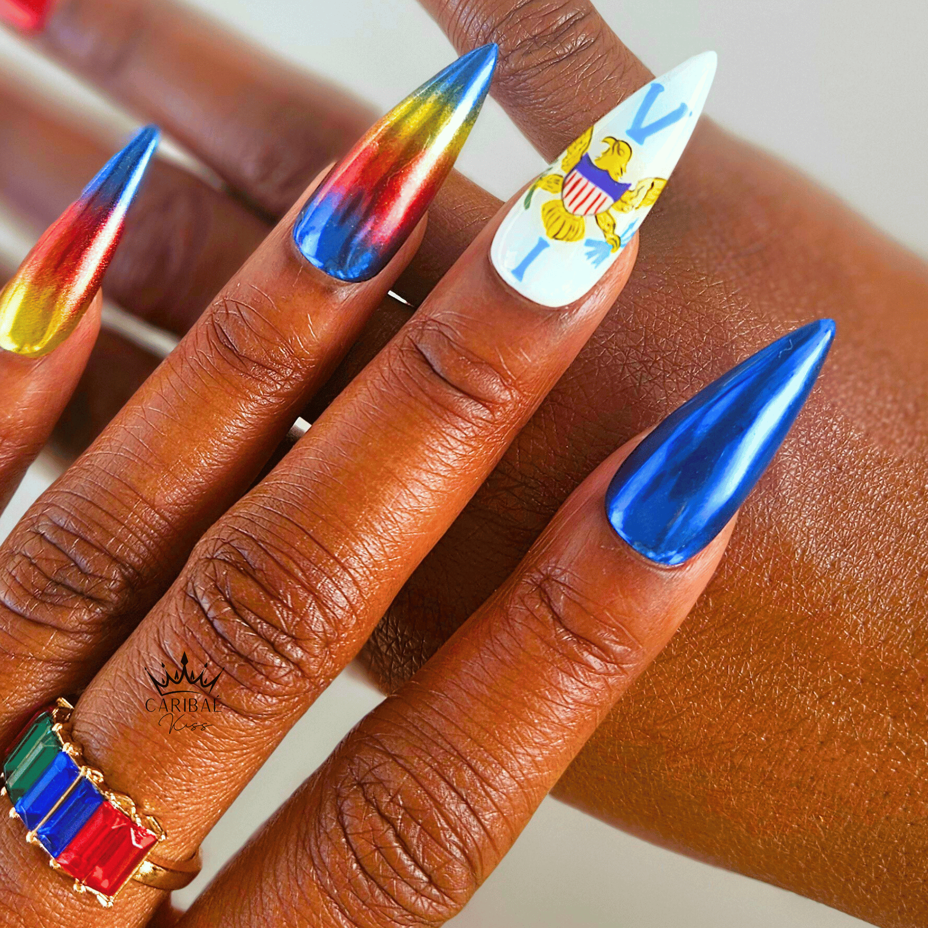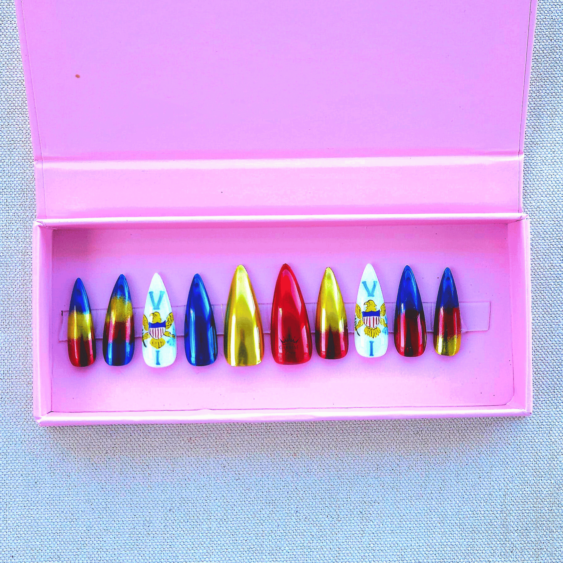 Celebrate U.S. Virgin Islands pride with this premium press-on nail set inspired by the iconic USVI flag and its powerful eagle emblem. Designed for bold expression, this set blends high-shine chrome blues with vibrant red and yellow accents that represent the islands' energy, resilience, and beauty.